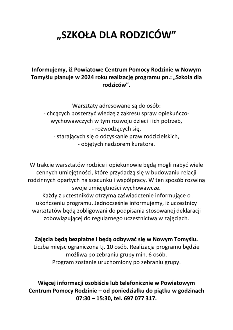 "SZKOŁA DLA RODZICÓW" W POWIATOWYM CENTRUM POMOCY RODZINIE W NOWYM TOMYŚLU