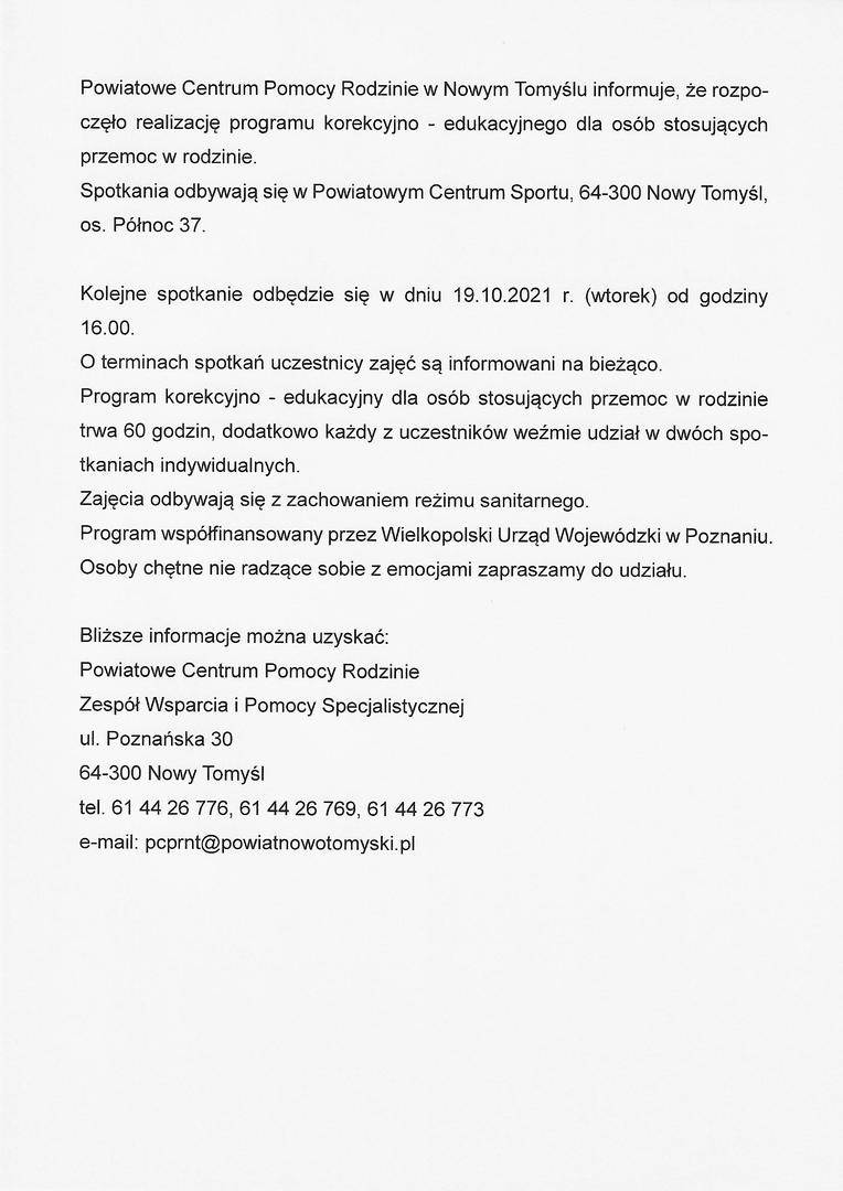 INFORMACJA O PROGRAMIE KOREKCYJNO-EDUKACYJNYM DLA OSÓB STOSUJĄCYCH PRZEMOC W RODZINIE