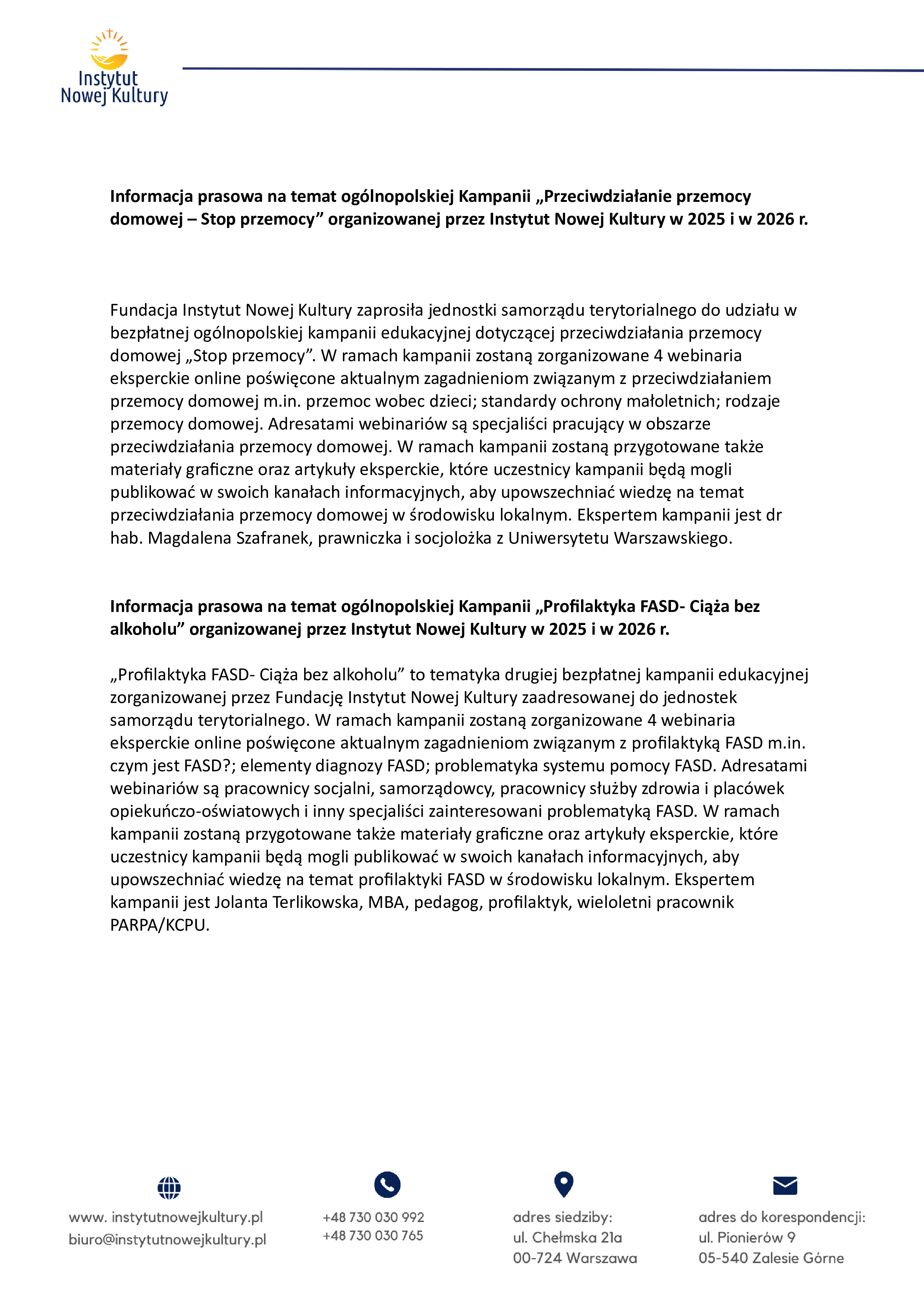 Informacja prasowa na temat ogólnopolskiej Kampanii "Przeciwdziałanie przemocy domowej - Stop przemocy" oraz "Profilaktyka FASD _Ciąża bez alkoholu"