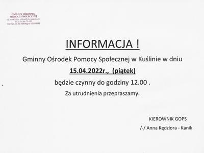 ZMIANA GODZINY OTWARCIA GOPS W DNIU 15.04.2022 R.