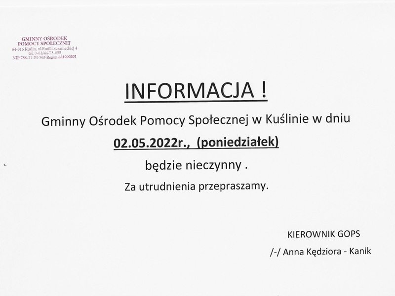 GMINNY OŚRODEK POMOCY W KUŚLINIE NIECZYNNY