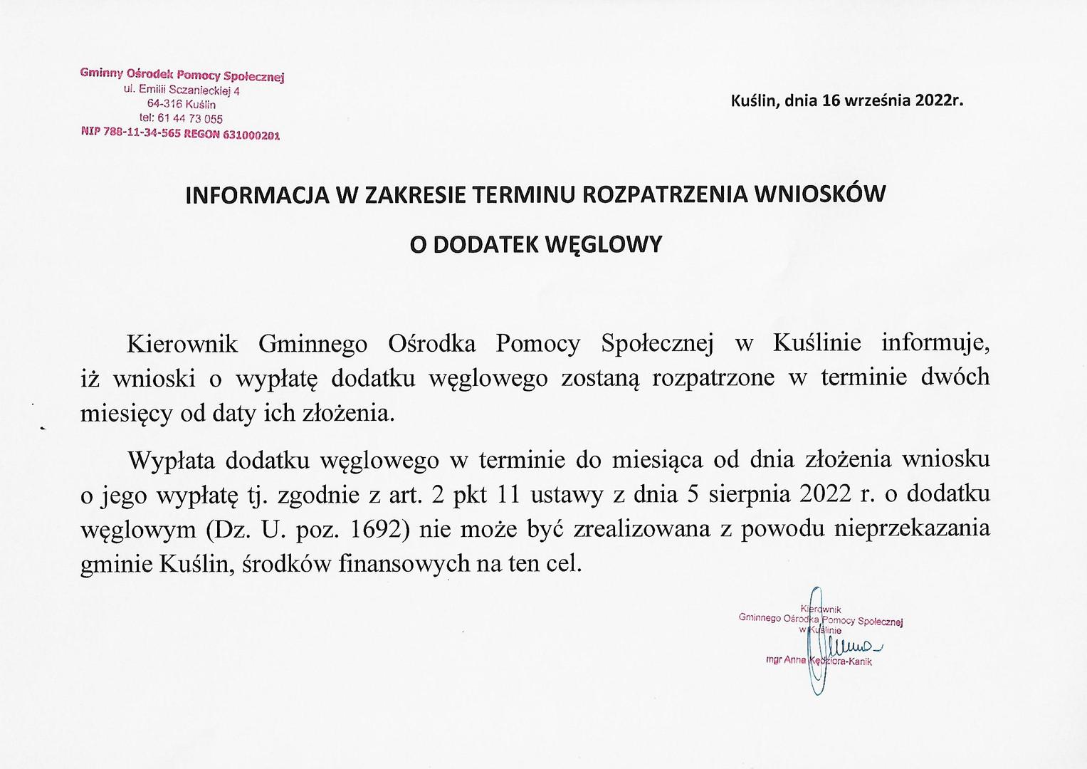 INFORMACJA W ZAKRESIE TARMINU ROZPATRZENIA WNIOSKÓW O DODATEK WĘGLOWY